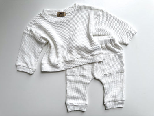 KIDS WAFFLE BOXY SWEATSHIRT AND JOGGER CO-ORD SET - BLANC WHITE