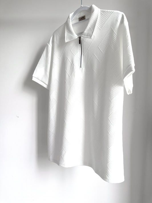 MENS TEXTURED PATTERN ZIP COLLAR POLO SHIRT - BLANC WHITE