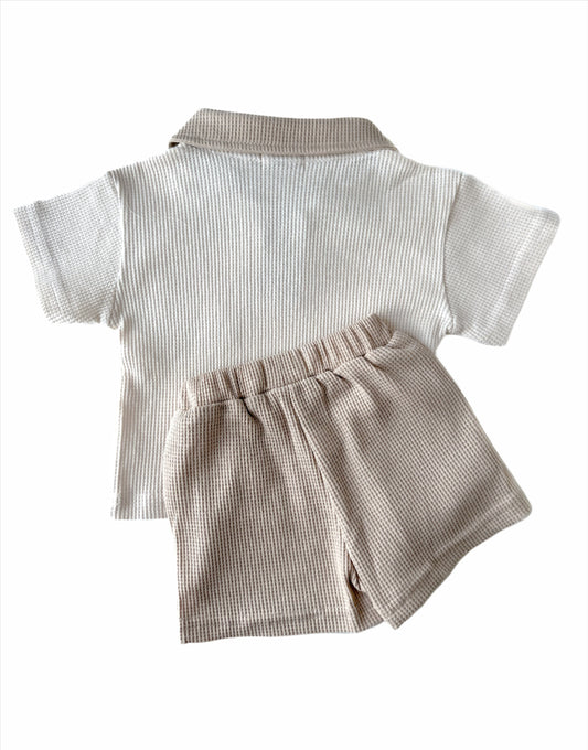 KIDS WAFFLE POLO AND SHORTS CO-ORD SET - MODERN BEIGE