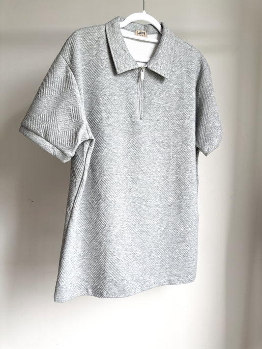 MENS TEXTURED PATTERN ZIP COLLAR POLO SHIRT - STORM GREY